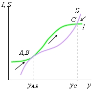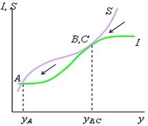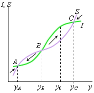 В точке B равновесие неустойчиво, так как при yA < y < yB сбережения превышают инвестиции и на рынке благ образуется избыток, который ведет к сокращению производства. Когда yB < y < yC, тогда объем инвестиций превышает объем сбережений и на рынке благ возникает дефицит, который стимулирует расширение производства.