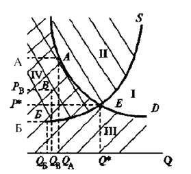 И только сектор IV представляет собой зону совпадения интересов как покупателя, так и продавца. Здесь возможны и покупки, и продажи, а значит, и совершение сделок весьма реально. Практически любая точка данного сектора символизирует условия возможной сделки. Например, лежащая на кривой спроса точка А показывает, что на данном рынке возможна купля-продажа количества данного товара QA по цене РА. Аналогично точка Б, расположенная на кривой предложения, означает возможность купли-продажи объема С по цене РБ.