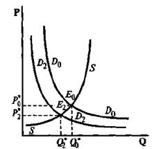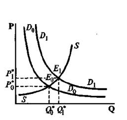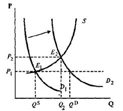 Что же в сложившейся ситуации в ответ предпримут продавцы такого товара? Вполне естественной их реакцией на повышение цены будет увеличение объема предлагаемого товара в полном соответствии с законом предложения. А поскольку на это же будут направлены действия покупателей, то их совместными усилиями рыночная цена при отмеченном росте количества товара начнет повышаться до величины Р2. На графике это будет выражено передвижением точки рыночной конъюнктуры Ех вдоль кривой предложения вплоть до ее пересечения с новой кривой спроса D2, где и будет тем самым достигнута новое равновесие данного рынка Е2 с параметрами Q2 и Р2.