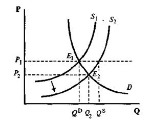 На графике (рис. 3) это приведет к сдвигу кривой предложения вправо—вниз: S1 -"S2. Если опять-таки считать, что в первый момент цена остается неизменной (P1), то рост предложения приведет к избытку товара, или затовариванию, в размере Sp= Qs— Qd. После этого начнется конкуренция продавцов, т.е. рынок приобретет характер избыточного, результатом чего станет снижение рыночной цены (с Р1 до Р2) и рост количества продаваемого товара. На графике это будет отражено перемещением точки рыночной конъюнктуры Е1 вдоль кривой спроса вплоть до ее пересечения с новой кривой предложения, что и будет означать установление нового равновесия Е2 с параметрами Q2 и Р2.