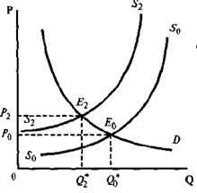 При уменьшении рыночного предложения (при перемещении линии рыночного предложения S0S0 влево в положение S2S2) цена равновесия Р* растет, а равновесное количество Q* падает (рис. 6).