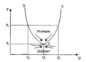Получается, что при указанных отклонениях цены от равновесного значения в самой данной рыночной системе возникнут силы, возвращающие ее в первоначальное состояние.