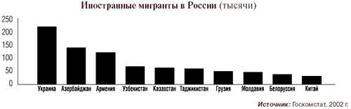 См.: Красинец Е., Кубишин Е., Тюрюканова Е. Нелегальная миграция в Россию. М., 2000. Иностранные мигранты в России (тысячи) Источник: Госкомстат, 2002 г.