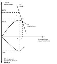 С точки зрения банка, оптимальный объём кредитования соответствует максимуму ожидаемой доходности по выданным кредитам ER* и процентной ставке i*. При более высоких процентных ставках кредитный риск под воздействием отрицательной селекции и угрозы недобросовестного поведения заёмщиков ведёт к снижению ожидаемой доходности по выданным кредитам. Поэтому рациональным поведением банка на кредитном рынке будет решение о наращивании выдачи кредитов в интервале процентной ставки (0;i*) и прекращение увеличения кредитного портфеля при любой ставке i > i*. При этом пересечение кривой спроса с линией предложения может достигаться правее уровня оптимальной кредитной ставки – в данном случае в точке E. Однако это не будет реальной точкой равновесия: на рынке установится ставка i* и возникнет дефицит кредитных ресурсов в объёме Z = Ld(i*) - Ls(i*) . Легко увидеть, что при уровне i банку выгоднее понизить ставку и сократить объём выдаваемых кредитов, тем самым увеличив свою прибыль. Таким образом, кредит оказывается рационирован в объёме Z .