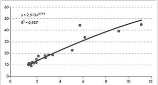 На российском банковском рынке наблюдается хорошо выраженная зависимость ставки по кредиту от удельного веса просроченной задолженности в кредитном портфеле. Она характеризуется степенной кривой, если рассчитывать на основе ежемесячных данных за 1998-2009 годы по всему банковскому сектору (рис. №4[6]
