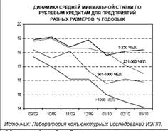 показывает, что минимальная предлагаемая ставка по кредитам крупным предприятиям (>1тыс.занятых) в марте составила 14,1% годовых, малым предприятия (1-250чел.) – 18,2%.