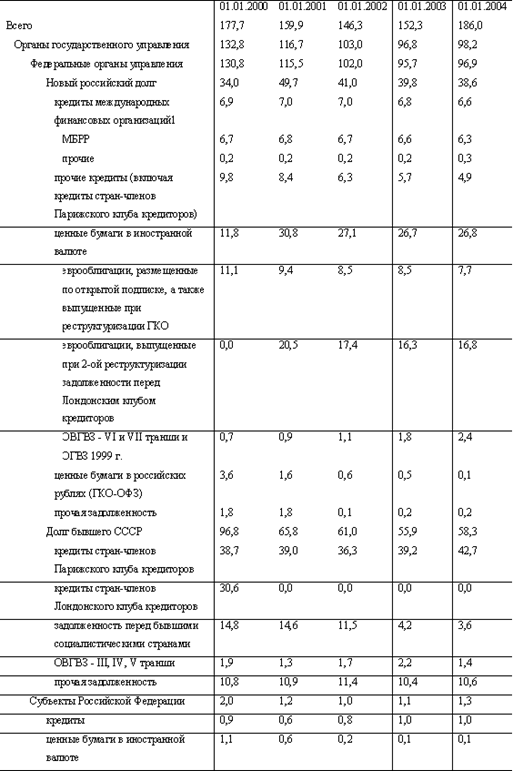 Внешний долг Российской Федерации в 2000-2004 годах (перед нерезидентами) (млрд. долларов США)