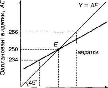 Лінія під кутом 45° на рисунку 3.4. відображає точки, в яких виконується умова економічної рівноваги. Рівновага досягається в точці Е, де лінія запланованих видатків перетинає лінію 45°. Цей графік називають "кейнсіанським хрестом".