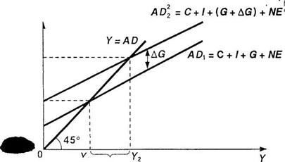 Якщо державні втрати зростають на (∆G), то крива планових витрат (AD1 = C + I + G + NE) зсувається вгору на таку ж величину (рис.3.5), а рівноважний обсяг виробництва зростає з Y1 до У2 на величину. ∆Y = ∆G • m G