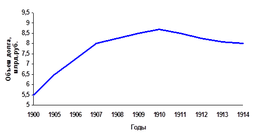 Публичные займы царской России размещались без определенного деления на внутреннюю и внешнюю задолженность, а состояли из двух основных категорий: займов для общих нужд государства (65%) и для строительства железных дорог (35%). На начало 1914г. общий публичный долг составлял 8,8 млрд. долл., иностранная часть задолженности была менее 45%.