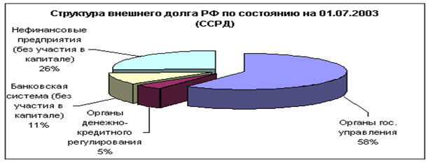В I полугодии 2003 г. долг органов государственного управления сократился на 2,7% и составил $94,2 млрд., причем наибольшая задолженность по-прежнему приходится на обязательства перед странами-членами Парижского клуба кредиторов – $41 млрд. и по ценным бумагам в иностранной валюте – $24,1млрд. Выделенная в качестве отдельной составляющей задолженность органов денежно-кредитного регулирования за рассматриваемый период не изменилась и составила $7,3 млрд. Обязательства банковской системы возросли с начала года на 19%. Преобладающие в структуре этого долга кредиты, а также текущие счета и депозиты увеличились на 35% и 18% соответственно, в то время как менее значимые долговые ценные бумаги и прочая задолженность, сократились. В абсолютном выражении сумма долга достигла $17,1 млрд. Долги нефинансовых предприятий, доля которых в совокупной сумме внешних обязательств государства составляет 26% (см. диаграмму), росли самыми быстрыми темпами – 21% с начала т.г. Абсолютная сумма увеличилась на $7 млрд. и составила $40,1 млрд. Таким образом, государственный внешний долг России, рассчитываемый, скорее, как долг экономики, несколько изменяет свою структуру в пользу увеличения частных обязательств.
