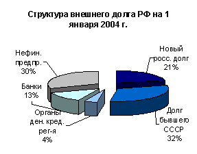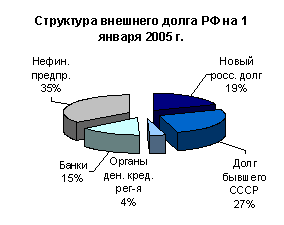 Удельные веса нового российского долга и задолженности бывшего СССР в совокупном объеме внешнего долга по состоянию на 1 января 2005 г. составили 19% и 27% соответственно (21% и 32% в 2004 г.).