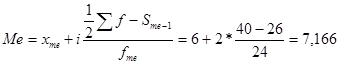 2) Находим моду и медиану стажа рабочих. Для этого строим вспомогательную таблицу.