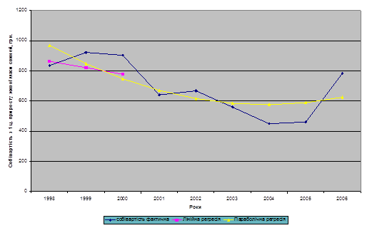Результати вирівнювання ряду динаміки собівартості продукції свинарства свідчать про нестійку тенденцію до збільшення собівартості 1ц. приросту живої маси свиней.