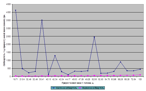 Рис. 2. Кореляційна залежність між собівартістю 1 ц. приросту живої маси свиней та прирстом живої маси 1 голови.