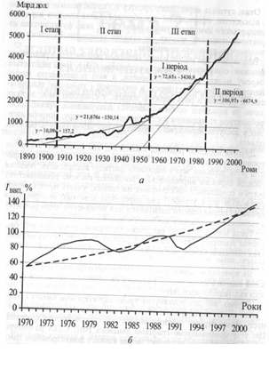 Відомо, що для розвинутих країн характерними були і є періодичні спади виробництва, які потім долалися таким чином, що в наступному періоді забезпечувалося навіть прискорене зростання. Цю тезу проаналізуємо графіком динаміки ВВП США на рисунку1.1, а. Середню лінію на графіку можна вважати довгостроковою траєкторією зростання. Вихід на таку траєкторію і повинен бути стратегічною метою будь-якої економіки. Аналіз статистичних даних показує, що середньорічні темпи приросту ВВП в розвинутих країнах за період з 1960 р. по 2004 р. становили 3,2 % (в тому числі в США -3,0 %). За період з 1985 р. по 2004 р. середньосвітові темпи приросту реального ВВП становили 3,5 %, в тому числі в розвинутих капіталістичних країнах - 2,9 % (уповільнення зростання показала Японія внаслідок значних структурних перетворень та ФРН внаслідок поглинання нею Німецької Демократичної Республіки), в нових індустріальних країнах Азії - 6,3 % і в США - 3,4 %.