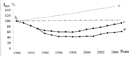 Штрихові лінії відповідають 3%-му середньорічному темпу зростання ВВП - знаходиться в процесі економічної трансформації, тобто переходу від одного стану соціально-економічної системи до якісно іншого стану. Вона має ряд специфічних характеристик, що відрізняє її від економіки, яка знаходиться у відносно стаціонарному стані і розвивається на власній основі, шляхом вдосконалення і змін характерних для неї інститутів, зв'язків і відносин.