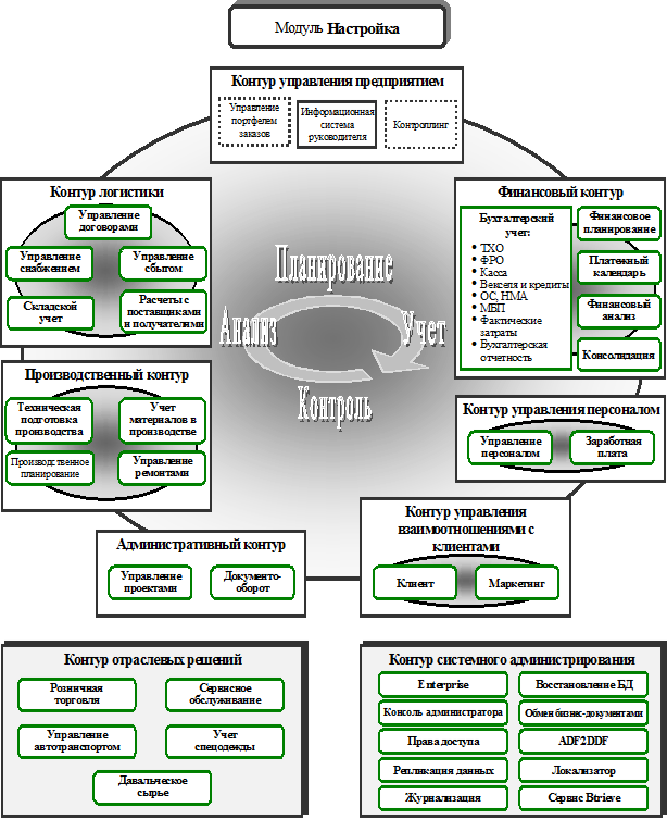 корпорация Галактика, Россия. Система Галактика ориентирована на автоматизацию решения задач, возникающих на всех стадиях управленческого цикла: прогнозирование и планирование, учет и контроль реализации планов, анализ результатов, коррекция прогнозов и планов. Система имеет модульную структуру, модули, в свою очередь, объединены в функциональные контуры (см. рис. 7, 8.). Пунктиром изображены модули, находящиеся в стадии разработки. Объединение модулей в контуры Логистики, Финансовый, Управления персоналом