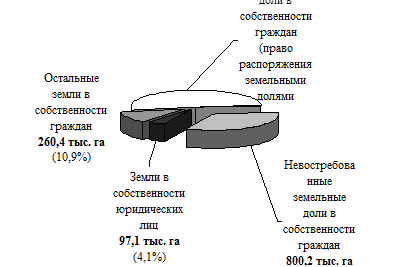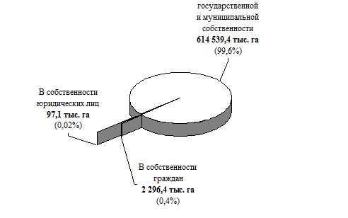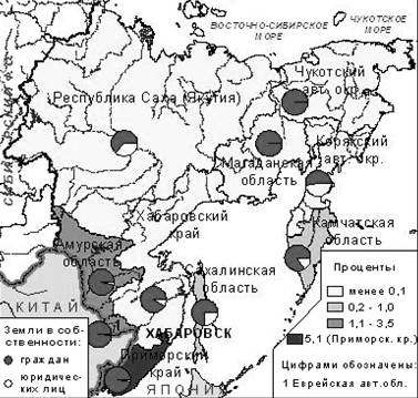 В состав Дальневосточного федерального округа входят следующие субъекты РФ: Республика Саха (Якутия), Приморский край, Хабаровский край, Амурская обл., Камчатская обл., Магаданская обл., Сахалинская обл., Еврейская авт. область, Корякский авт. округ, Чукотский авт. округ. Центр федерального округа - г. Хабаровск. Структура земель ДВФО по форме собственности по субъектам РФ представлена на рис.1.