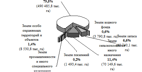 По назначению земли региона можно разделить на земли сельскохозяйственного назначения, земли поселений, земли промышленности и иного специального назначения, земли особо охраняемых территорий и объектов, земли лесного фонда, земли водного фонда, земли запаса. Структура земель ДВФО по назначению представлена на рис.2.