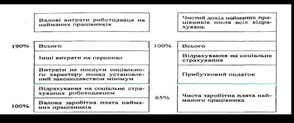 Як видно з рисунка, на підприємствах Німеччини робітник одержує в касі підприємства лише 35% того, що витрачає роботодавець прямо чи опосередковано на використання найманої ним робочої сили.