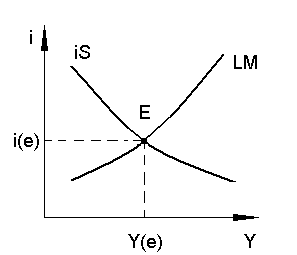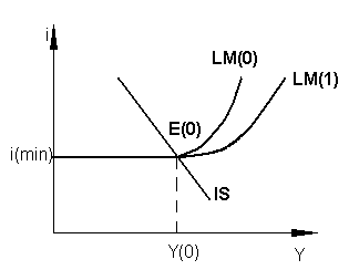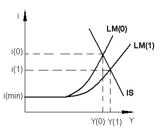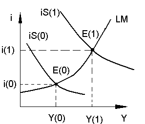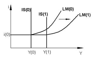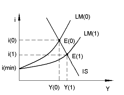 Если кривая IS не меняет положения, то возрастание денежной массы (из LM(0) в LM(1)) приведет к снижению процентной ставки с L(0) до i(1). Товарные рынки отреагируют на это снижение ростом инвестиционного спроса, расширением занятости, а следовательно, мультипликационным увеличением национального выпуска с Y(0) до Y(1).