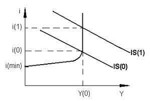 Однако иная картина будет иметь место в ситуации инвестиционной ловушки, которая складывается в том случае, когда спрос на инвестиции не эластичен по процентной ставке, например. Когда инвесторы пессимистически оценивают перспективы своих капиталовложений вследствие непредсказуемости будущей экономической конъюнктуры. В этом случае кривая IS вертикальна. Это значит, что сдвиг кривой LM на любой из ее участков не изменит величину реального дохода. Следовательно, денежно-кредитная политика (изменение количества денег в экономике) не окажет никакого влияния на совокупный спрос и национальный выпуск. Эффективной будет лишь фискальная экспансия, которая приведет к сдвигу кривой IS(0) в положение IS(1), а значит, к росту дохода с Y(0) до Y(1).