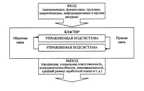 Изображенная на рисунке графическая модель кластера показывает, что такая система является открытой, ибо ее отдельные элементы взаимодействуют не только между собой, но и с внешней средой. Назначение системы — трансформация ресурсов в готовые продукты. В состав управляющей подсистемы, призванной обеспечить в пределах кластера указанную трансформацию, входят соответствующие органы, созданные всеми участниками кластерного образования, административные помещения, технологии управления, коммуникационные средства и др. В состав управляемой подсистемы входят исполнители (работники предприятий — участников кластера, финансово-кредитных учреждений, социальных служб, проектных организаций, научно-исследовательских институтов и т. д.), а также необходимые им для работы технические, организационные,