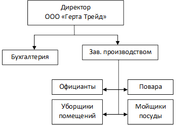 Организационная структура ООО "Герта Трейд" представлена на рисунке 1.1. Численность работников ООО "Герта Трейд" на 01.01.2010 г. составила 22 чел. Во главе ООО "Герта Трейд" стоит директор, который управляет работой кафе: контролирует процесс обслуживания посетителей; управляет работой сотрудников (в том числе своих заместителей), устанавливает приоритеты в работе и осуществляет действия, способствующие поддержанию основного принципа: ориентация на интересы посетителя; выявляет и исправляет случаи несоблюдения или несоответствия стандартов работы прежде, чем они повлияют на впечатления посетителей; контролирует и поддерживает качество работы в соответствии с соблюдением технологических норм, правил заказа, получения, хранения, приготовления продуктов, полуфабрикатов и быстрой реализации готовых блюд.