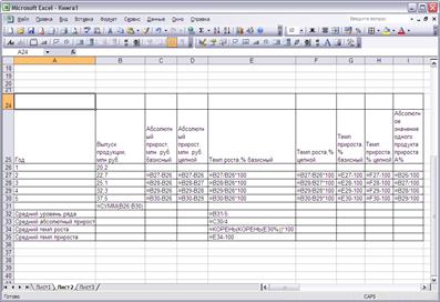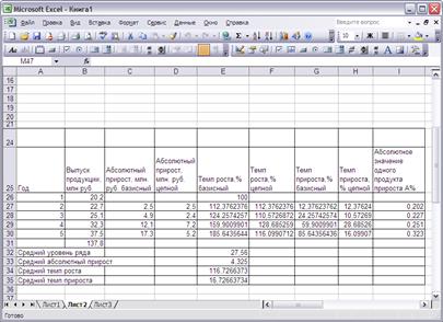 - средние за период уровень ряда, абсолютный прирост, темпы роста и прироста.