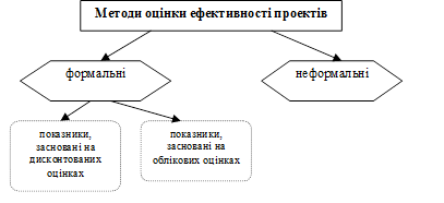 Прийняття проектних рішень, як і будь-який інший вид управлінської діяльності, ґрунтується на використанні різноманітних формалізованих і неформалізованих підходів. Формальні методи передбачають використання математичного апарату для розрахунку показників ефективності, неформальні - евристичних підходів до оцінки проектів. Методи оцінки ефективності проектів можна схематично представити у вигляді схеми, зображеної на рис.