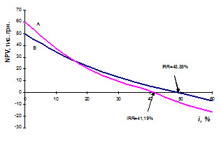 Наочно тлумачення внутрішньої ставки доходності може бути проілюстровано на прикладі порівняння двох умовних проектів через профіль чистої теперішньої вартості. Він показує взаємозв’язок між NPV і вартістю капіталу за інвестиційним проектом (рис). Точка, в якій крива NPV перетинає вісь абсцис, визначає значення внутрішньої ставки доходності.