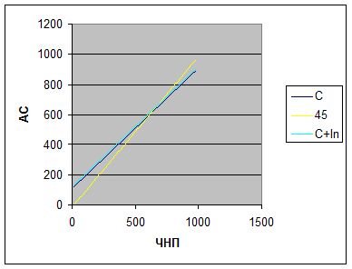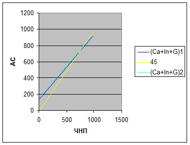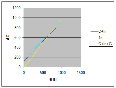 На рис. 1 представлен график с позиции анализа потоков совокупных расходов – объема производства, на котором можно увидеть, что равновесие производства будет достигнуто на уровне 667,5 млрд. руб. Равновесие будет в точке пересечения кривой АС(C+In) и кривой в 45.