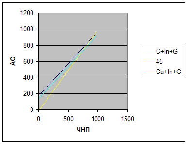 В данном случае чистый экспорт у нас отрицателен, в связи с этим совокупные расходы уменьшились и в результате уменьшился равновесный ЧНП.