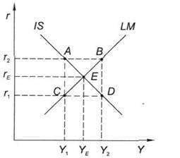 ) высока для равновесия на денежном рынке. Избыток предложения денег означает, что у экономических субъектов появились "лишние деньги". Это заставит их покупать облигации. Рост спроса на последние приведет к повышению их рыночной цены, что станет причиной понижения процентной ставки, сопровождаемого ростом планируемых инвестиций, совокупных расходов, а значит и увеличением равновесного дохода. Все эти процессы приведут к перемещению по кривой IS вниз, к точке Е.