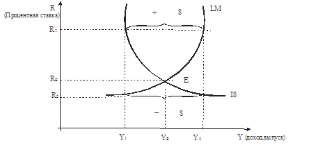 . В состоянии равновесия два названных рынка сбалансированы. То есть равновесие на товарном и денежном рынках отражает такое состояние экономики, когда равновесная процентная ставка (R