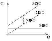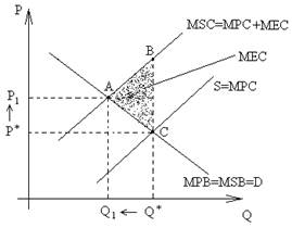 отнюдь не равен нулю). Однако ущерб от загрязнения существенно уменьшается. Площадь треугольника АВС показывает потери эффективности, связанные с тем, что предельные частные издержки оказались ниже предельных социальных издержек. Таким образом, при наличии отрицательного внешнего эффекта экономическое благо продается и покупается в большем по сравнению с эффективным объеме, т.е. имеет место перепроизводство товаров и услуг с отрицательными внешними эффектами и занижение их цен. Это вызвано невключением части издержек производства в цену продукции, что равнозначно их бесплатному использованию.
