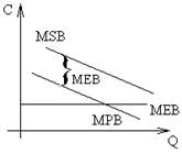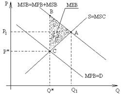 Рыночное равновесие С устанавливается в точке пересечения предельных частных выгод и предельных социальных издержек: МРВ = MSC. Между тем, предельные социальные выгоды больше предельных частных выгод на величину предельных внешних выгод. Поэтому эффективное для общества равновесие достигалось бы в точке пересечения предельных социальных выгод и издержек, т.е. в точке А. Эффективность увеличивается на площадь треугольника АВС. Таким образом, последствия положительного внешнего эффекта проявляются в завышенной цене блага и недостаточном спросе на него, что означает недопроизводство блага.