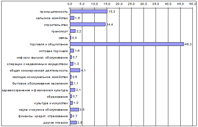 Как видно на приведенной диаграмме, практически половина предприятий малого бизнеса относится к сфере торговли и общественного питания. Также, достаточно много предприятий в промышленности и строительстве. Обращает внимание малое количество предприятий в сфере бытового обслуживания населения (1,1 % от общего числа малых предприятий), хотя считается, что данная отрасль является одной из наиболее оптимальных.