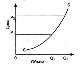 Последняя наглядно показывает, какую цену необходимо заплатить за единицу товара для каждого его количества, чтобы данный объем блага был произведен и поставлен на рынок. Для большинства товаров кривая предложения имеет следующую форму (рис. 4).