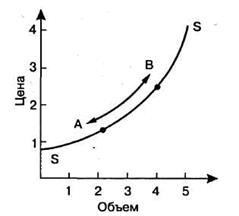 Из рисунка мы видим, что имеет место перемещение от одной точки (А) кривой предложения к другой точке этой кривой (В). Таким образом, движение вдоль кривой предложения означает, что происходит изменение величины (объема) предложения благ, когда ни один из факторов, влияющих на предложение, не меняется, а цена данного блага изменяется.
