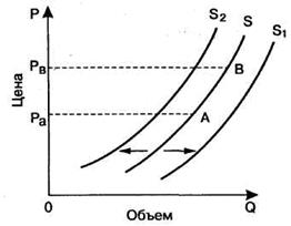 Сдвиг кривой предложения выражает реакцию производителей на вариацию неценовых факторов, влекущих изменение величины предложения (даже его характера). Данный процесс иллюстрируется сдвигом все кривой предложения. При этом смещение вправо характеризует увеличение предложения, сдвиг влево – его сокращение (рис. 6).