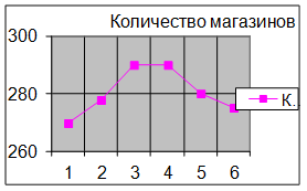 С 1 по 3 годы наблюдается увеличение количества магазинов. Количество магазинов в 4-м году составило столько же, сколько и в 3-м. Затем количество магазинов стало уменьшаться. То есть наблюдаются переломы тенденции.