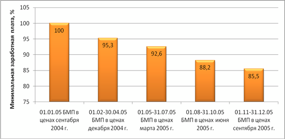 Соотношение минимальной заработной платы и бюджета прожиточного минимума (БМП) в среднем на душу населения в течение 2005г