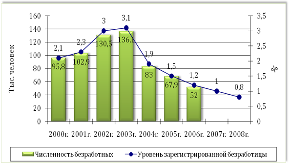 Еще одна забота государства - сохранение контролируемой ситуации и удержание безработицы в социально приемлемых размерах. В течение длительного периода ситуация на рынке труда характеризовалась устойчивым повышенным предложением рабочей силы при снижении спроса на нее. Результатом этого стал рост регистрируемой безработицы с 2,1% в 2000 г. до 3,1% в 2003 г. Начиная с 2004 г. спрос на рабочую силу начал расти, что привело к снижению безработицы – до 1,5% от экономически активного населения в 2005 г. В 2006 г. численность безработных составила 52 тыс. человек и ее уровень упал до 1,2%. В 2008 г. ситуация на рынке труда Республики Беларусь характеризовалась увеличением спроса на рабочую силу, улучшением показателей использования рабочего времени, снижением масштабов вынужденной неполной занятости, относительно невысоким и стабильным уровнем регистрируемой безработицы (в пределах 0,8—1,1% от общей численности экономически активного населения). На 1 января 2009 г. уровень безработицы в республике составил 0.8%. Уровень безработицы свыше 2% отмечен в Ганцевичском (2,1%) и Поставском (2,1%) районах. Улучшилась конъюнктура рынка труда: сегодня на одну вакансию претендует 1,2 человека, в то время как в 2000 г. – 2,9.