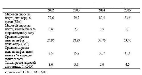 В период 1991–2005 гг., рост мирового ВВП на 1% сопровождался увеличением мирового потребления нефти в среднем на 0,37%. Снижение темпов роста мировой экономики неизменно приводит к падению мировых цен на нефть. Так, при темпах роста мирового ВВП менее 1% в год, такая ситуация имела место в 1998 и 2001 гг., мировые цены на нефть неизменно падали, причем их годовое снижение превышало 10% (Табл. Б.1).