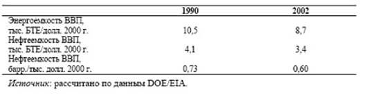 Существенное влияние на мировой спрос на нефть оказывает энергоемкость мировой экономики, то есть потребление энергии на единицу ВВП. Рост доли неэнергоемких отраслей и повышение эффективности энергопотребляющих технологий ведут к снижению энергоемкости экономики. По мере развития экономики снижается также ее нефтеемкость, то есть потребление нефти на единицу ВВП (Табл. Б.4.).