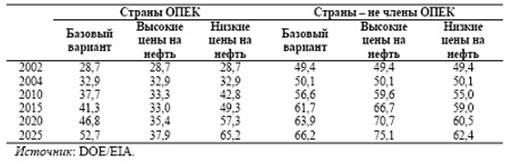 Таблица 3.3. Производство нефти странами ОПЕК и странами – не членами ОПЕК, 2002-2025гг., млн.барр./сутки