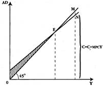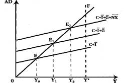 Прибавив к автономным расходам и расходы на чистый экспорт (NX), мы будем все более приближаться к уровню полной занятости (точка F). Общая идея ясна – каждое добавление какого-либо элемента автономных расходов будет сдвигать вверх линию совокупных расходов. Графическая интерпретация модели равновесия по Кейнсу представлена на рисунке 7, которая в экономической теории также известна как «кейнсианский крест».