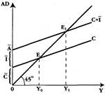 Чем больше автономные инвестиции, тем выше поднимается график совокупных расходов и тем ближе «заветный» уровень полной занятости. Если же государство будет само осуществлять автономные расходы G, то линия совокупных расходов поднимется еще выше: точка Е1